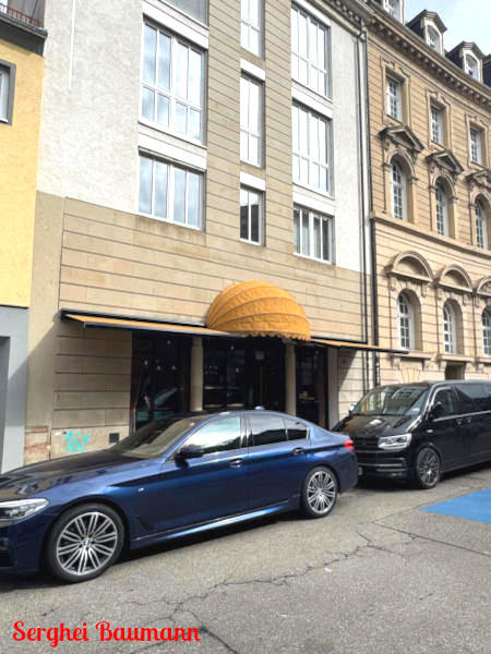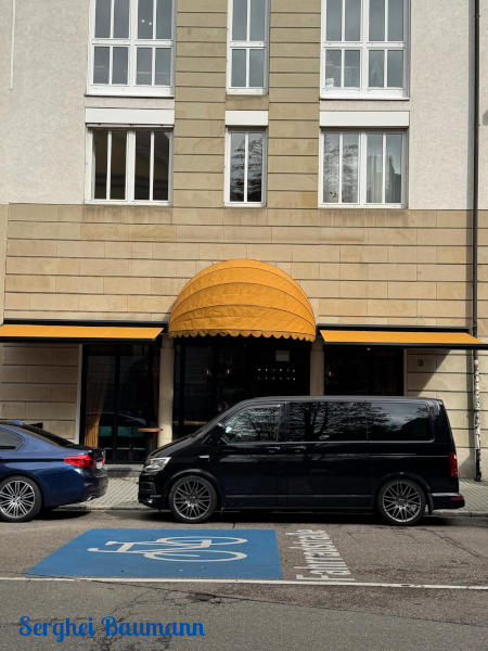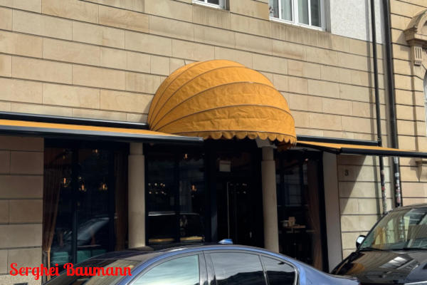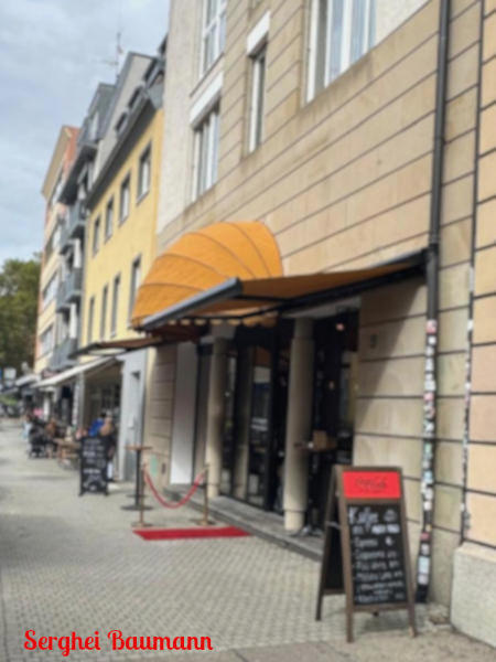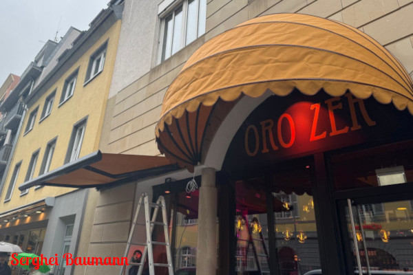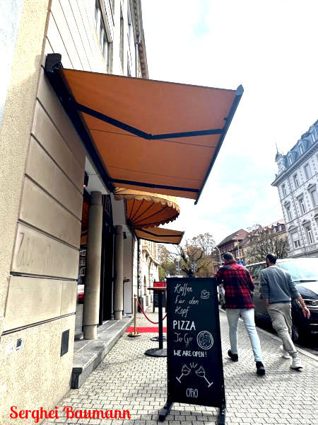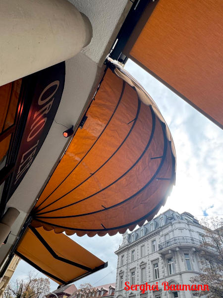 Der Inhaber des Freiburger Cafés ORO ZER ließ sich über dem Eingang nit Rundbogen eine Korbmarkise (Typ St. Tropez) anbringen. Über dem linken und rechten Fenster wurde jeweils eine Vollkasettenmarkise (Typ ON'X) mit gleichem Behang angebracht.