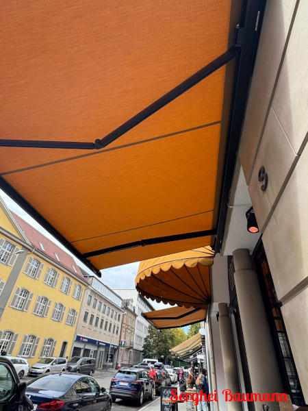 In einer südbadischen Kurstadt musste das Markisentuch mit Volant getauscht werden.